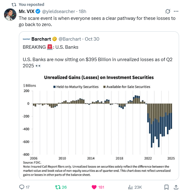 Banks are sitting on ~$395B in paper losses because they bought lots of long bonds when rates were low.