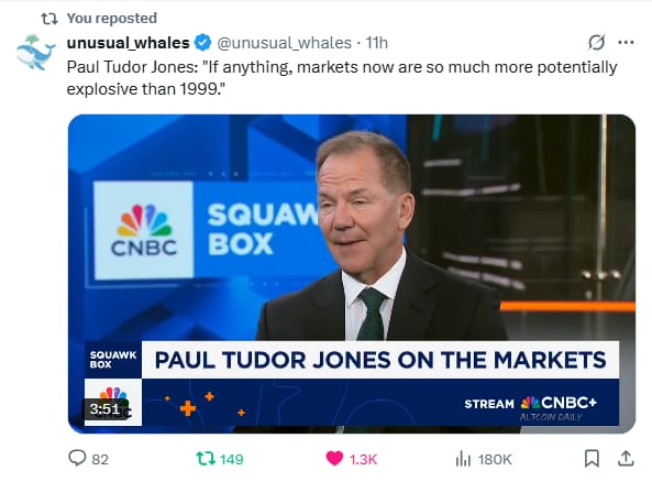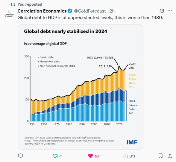 Paul Tudor Jones says today’s setup is “more explosive than 1999” — and the data agrees:• $22.3 T Treasury issuance YTD (SIFMA) → liquidity vacuum.• $395 B bank unrealized losses (FDIC Q2 2025) → fragile balance sheets.• 11.8 % office CMBS delinquencies (Wolf Street) → credit stress climbing.• Global debt = 235 % of GDP (IMF 2025) → debt-on-debt gravity.• Zombie firms surging (Bloomberg) → refinancing cliff.• Silver vaults bleeding bars (Sunil Reddy) → physical metal reclaiming price discovery.Leverage towers built on cheap money are wobbling as real funding thins. Truth is repricing fiction — and only what settles now (gold, silver, cash flow) still breathes.