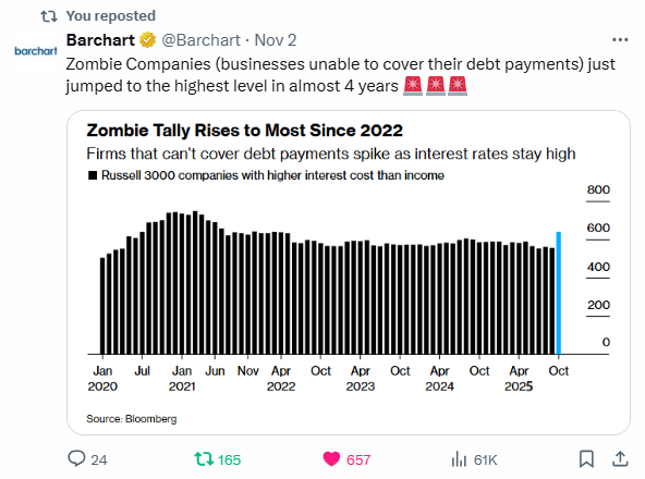 That debt rolled and rolled. Now rates are higher and liquidity is thinner, so the interest bill > income. That’s a zombie—living off credit, not cash flow.