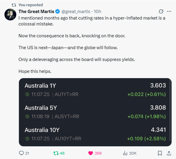 Turning the rate dial back down without cutting leverage reignites the heat. The pressure shows up first in sovereign yields—Australia today is the dashboard light telling you the whole system is over its skis on leverage.